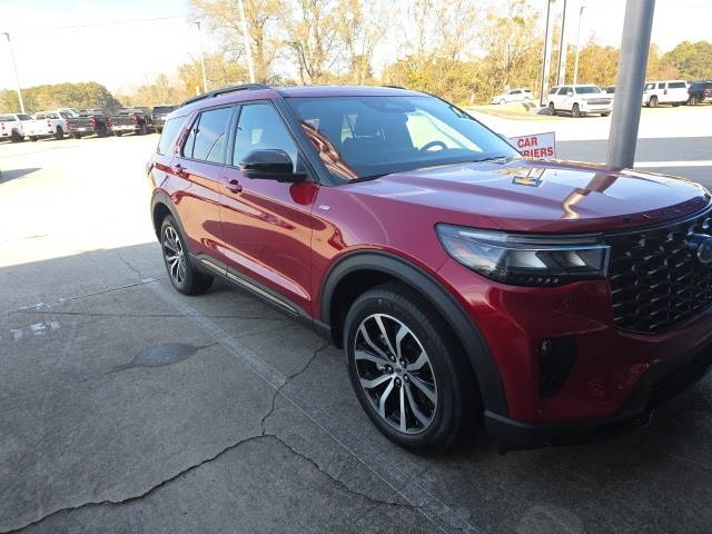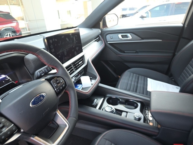 CARFAX One-Owner. Explorer ST-Line, 4D Sport Utility, 2.3L EcoBoost I-4, 10-Speed Automatic, 4WD, Red Metallic, Onyx Cloth, 10 Speakers, 2nd Row Captain's Chairs w/E-Z Entry & Armrest, 3.58 Non-Limited Slip Rear Axle, 3rd row seats: bench, 4-Wheel Disc Brakes, ABS brakes, Air Conditioning, Alloy wheels, AM/FM radio: SiriusXM with 360L, Apple CarPlay/Android Auto, Auto High-beam Headlights, Automatic temperature control, Brake assist, Bumpers: body-color, Compass, Delay-off headlights, Driver door bin, Driver vanity mirror, Dual front impact airbags, Dual front side impact airbags, Electronic Stability Control, Emergency communication system: 911 Assist, Equipment Group 300A Standard Package, Exterior Parking Camera Rear, Four wheel independent suspension, Front anti-roll bar, Front Bucket Seats, Front Center Armrest, Front dual zone A/C, Front fog lights, Front reading lights, Fully automatic headlights, Garage door transmitter, Heated door mirrors, Heated front seats, Heated steering wheel, Heated Unique Cloth Captain's Chairs, Illuminated entry, Internet access capable: FordPass Connect 5G, Knee airbag, Leather steering wheel, Low tire pressure warning, Navigation System, Occupant sensing airbag, Outside temperature display, Overhead airbag, Overhead console, Panic alarm, Passenger door bin, Passenger vanity mirror, Power door mirrors, Power driver seat, Power Liftgate, Power passenger seat, Power steering, Power windows, Radio: B&O Sound System by Bang & Olufsen, Rear air conditioning, Rear anti-roll bar, Rear reading lights, Rear window defroster, Rear window wiper, Remote keyless entry, Security system, Speed control, Speed-sensing steering, Speed-Sensitive Wipers, Split folding rear seat, Spoiler, Steering wheel mounted audio controls, Tachometer, Telescoping steering wheel, Tilt steering wheel, Traction control, Trip computer, Variably intermittent wipers, Wheels: 20" Ebony-Painted Machined Aluminum.