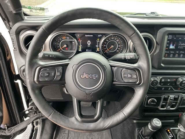 Equipped with the Customer Preferred Package 22S, Technology Group, Convenience Group, and Cold Weather Group, this Wrangler adds upgraded convenience and comfort features including power windows and locks, remote keyless entry, leather-wrapped steering wheel, 7-inch color display with Uconnect 4, Apple CarPlay, Android Auto, SiriusXM radio, automatic climate control, heated front seats, heated steering wheel, and remote start. The Premium Black Sunrider soft top and side steps add both style and function.