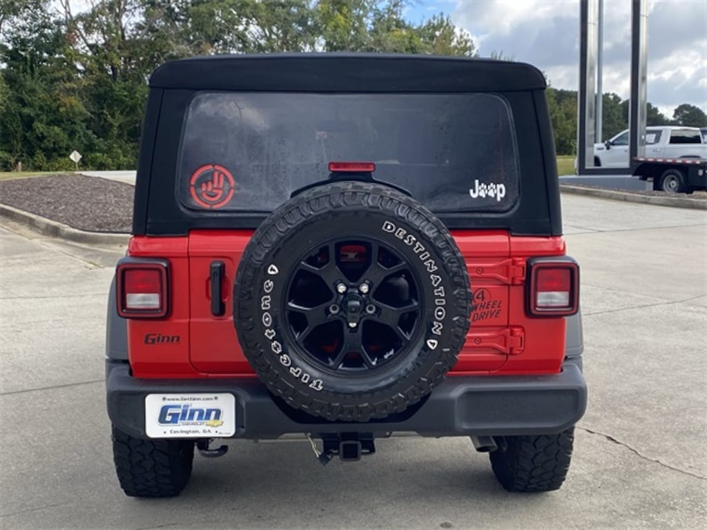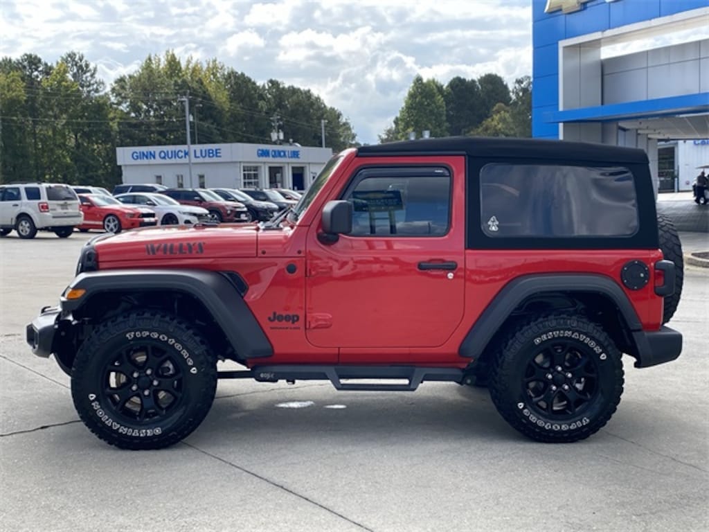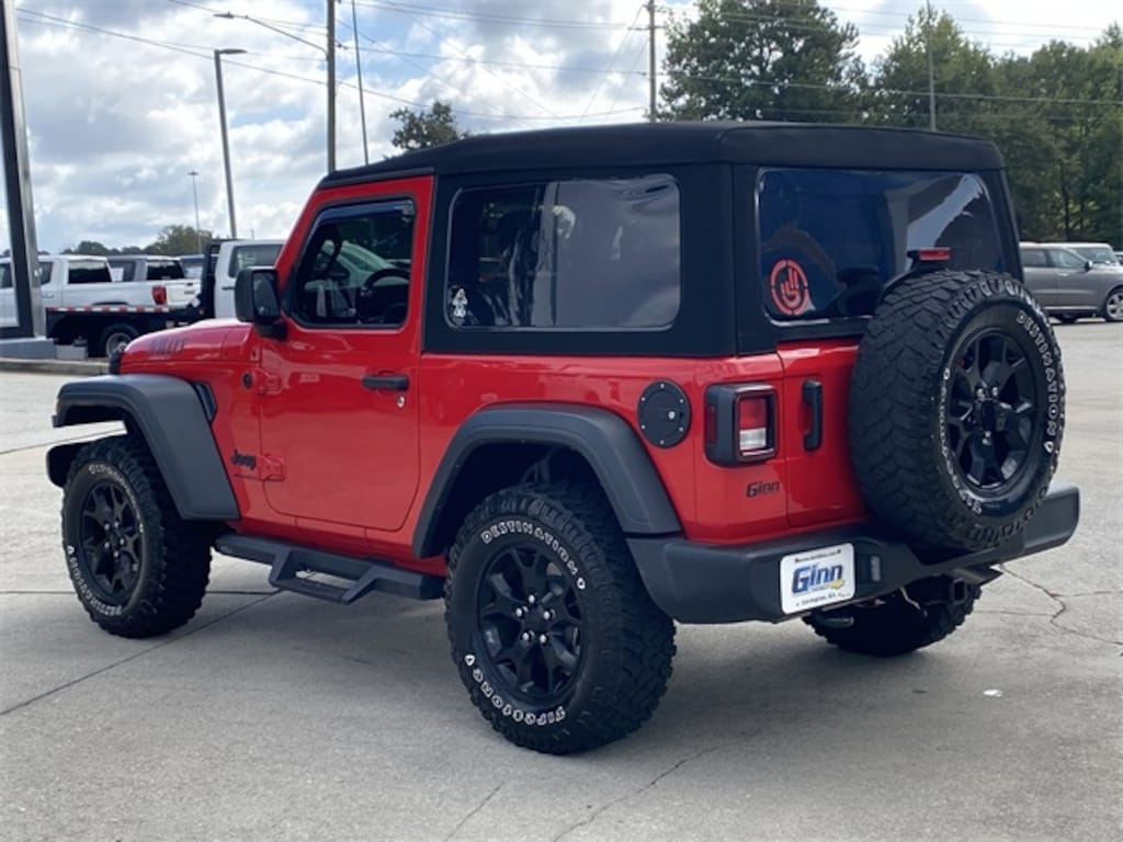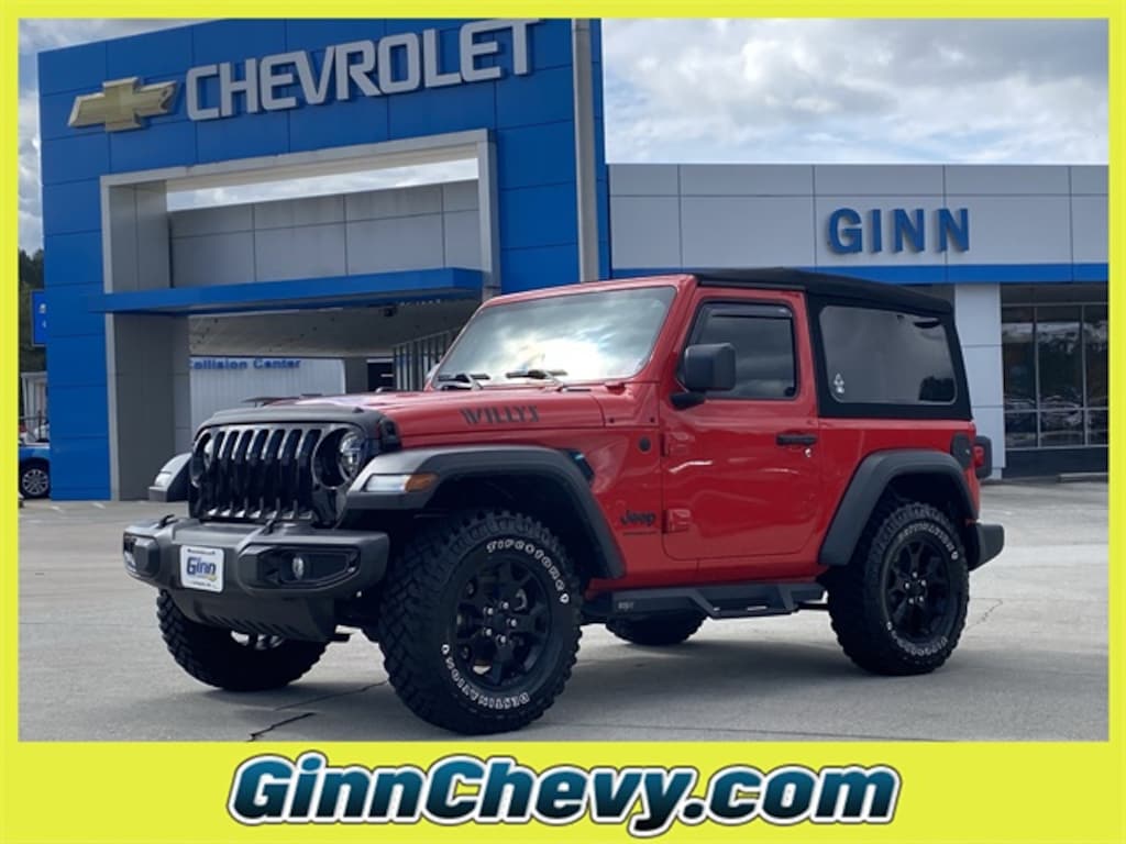 Clean CARFAX. CARFAX One-Owner. *FRESH LOCAL TRADE -MORE PICTURES COMING SOON, *ONSTAR, READY FOR THE TRAILS, Wrangler Willys, 2D Sport Utility, 3.6L V6 24V VVT, 8-Speed Automatic, 4WD, Firecracker Red Clearcoat, 3.45 Overall Top Gear Ratio, 4-Wheel Disc Brakes, 4-Wheel Drive Swing Gate Decal, 7.0" Touchscreen Display, 8 Speakers, 97 MPH Vehicle Max Speed Calibration, ABS brakes, Air Conditioning, Air Conditioning w/Auto Temperature Control, Air Filtering, AM/FM radio, Anti-Spin Differential Rear Axle, Apple CarPlay, Automatic Headlamps, Auxiliary Battery, Black Grille, Black Trail Rated Badge, Brake assist, Bridgestone Brand Tires, Cloth Low-Back Bucket Seats, Cluster 7.0" TFT Color Display, Compass, Convenience Group, Deep Tint Sunscreen Windows, Delay-off headlights, Driver door bin, Driver vanity mirror, Dual front impact airbags, Dual front side impact airbags, Electronic Stability Control, Emergency communication system: SiriusXM Guardian, Engine Oil Cooler, For More Info, Call 800-643-2112, Front 1-Touch Down Power Windows, Front anti-roll bar, Front Bucket Seats, Front Center Armrest w/Storage, Front Door Locks 2-Door Passive Entry, Front fog lights, Front LED Fog Lamps, Front reading lights, Global Telematics Box Module (TBM), Google Android Auto, GPS Antenna Input, Integrated Center Stack Radio, Integrated roll-over protection, Integrated Voice Command w/Bluetooth, Leather Wrapped Steering Wheel, LED Headlamp & Fog Lamp Group, LED Premium Reflector Headlamps, Low tire pressure warning, Matte Black Jeep Badge, Mold In Color Bumper w/Gloss Black, MOPAR All-Weather Floor Mats, Non-Locking Fuel Cap w/o Discriminator, Normal Duty Suspension, Occupant sensing airbag, Outside temperature display, ParkView Rear Back-Up Camera, Passenger door bin, Passenger vanity mirror, Power Heated Mirrors, Power steering, Premium Black Sunrider Soft Top, Quick Order Package 24W Willys, R1234YF A/C Refrigerant, Radio: Uconnect 4 w/7" Display, Rear anti-roll bar, Rear reading lights, Remote Keyless Entry, Security Alarm, SiriusXM Guardian-Included Trial (B), SiriusXM Radio Service, SiriusXM Satellite Radio, Speed Sensitive Power Locks, Start-Stop Dual Battery System, Steering wheel mounted audio controls, Sun Visors w/Illuminated Vanity Mirrors, Tachometer, Technology Group, Telescoping steering wheel, Tilt steering wheel, Traction control, Trip computer, Universal Garage Door Opener, USB Host Flip, Variably intermittent wipers, Wheels: 17" x 7.5" Moab Black Aluminum, Willys, Willys Hood Decal.